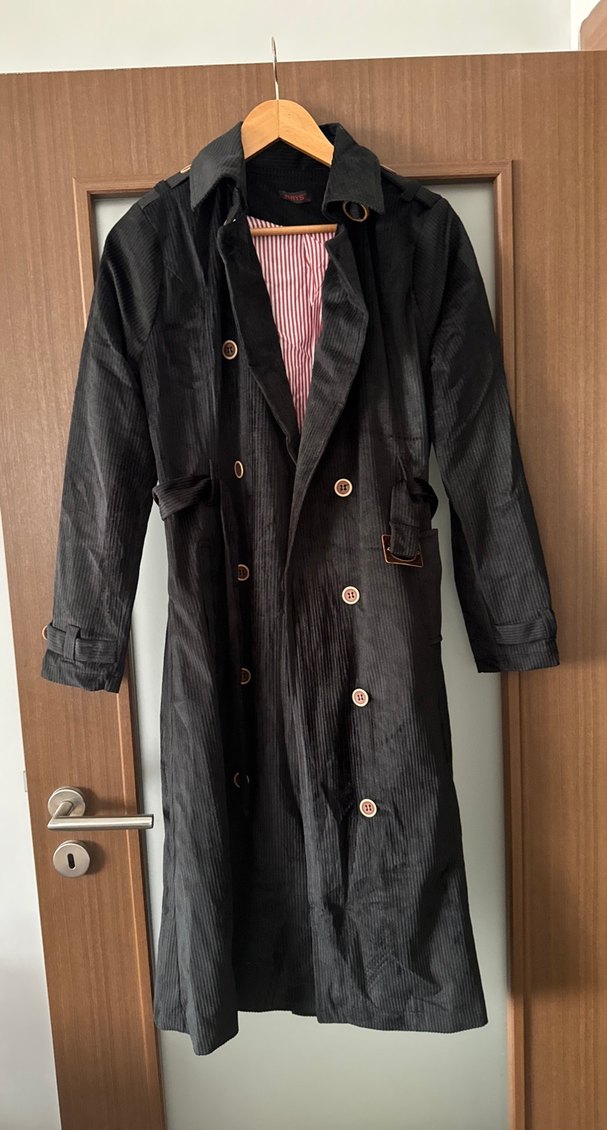 Siyah süet malzemeden yapılmış, düğmeli uzun kollu, uzun boy trençkot. Notlu yaka ve regular fit kesime sahip, günlük sokak tarzına uygun. Xl yazıyor fakat kalıbı küçüktür bir defa tek kullanılmıştır tertemiz