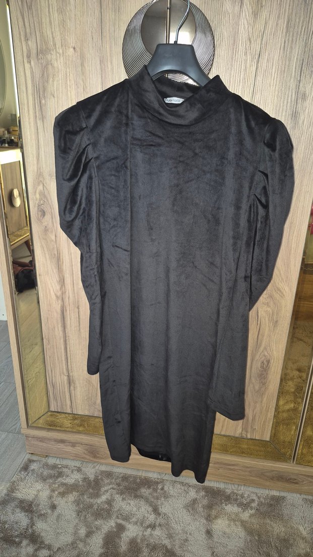 Siyah süet kumaştan, uzun kollu ve yüksek yakalı, bol kesim, dökümlü kadın tunik. Gotik tarzıyla trend ve avangart bir görünüm sunar.
