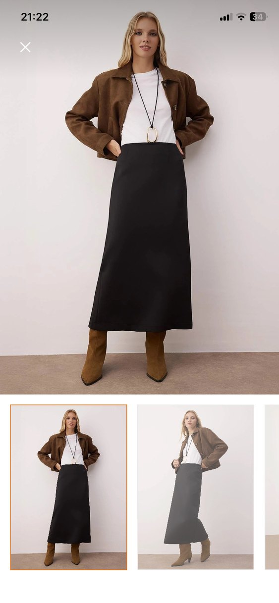 Siyah süet uzun etek, düzenli kesim ve minimal normcore tarzıyla dikkat çeker. Desensiz ve yumuşak dokulu, ofis için rahat ve şık bir seçimdir.