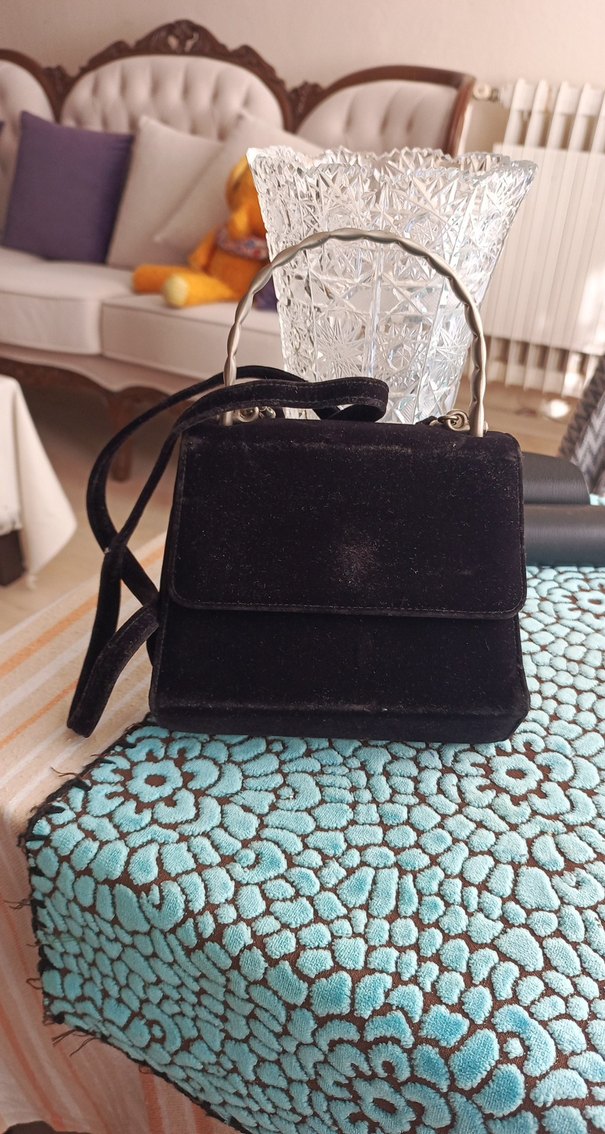 Siyah süet kadın çanta, vintage tarzı ve tokalı kapak detayıyla romantik akşamlar için uygun bir modeldir.