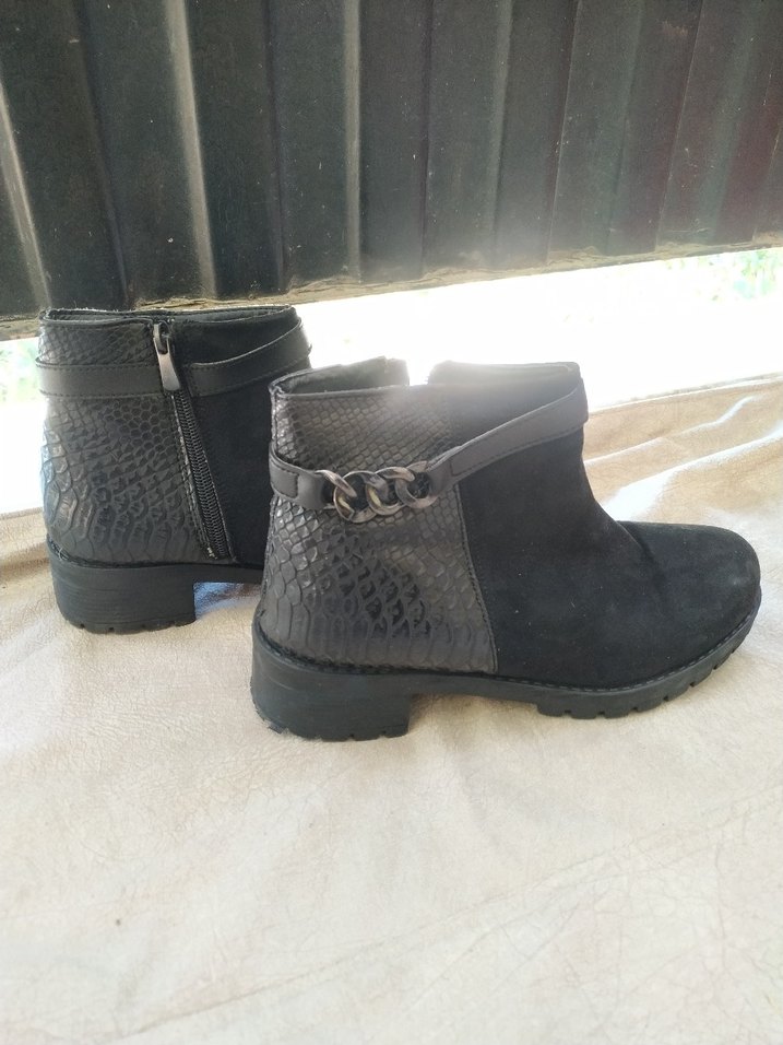 Siyah süet dolgu topuklu kadın bot, kemerli detaylarla, rahat ve gotik tarzda, günlük kullanıma uygun. hiç kullanılmadı