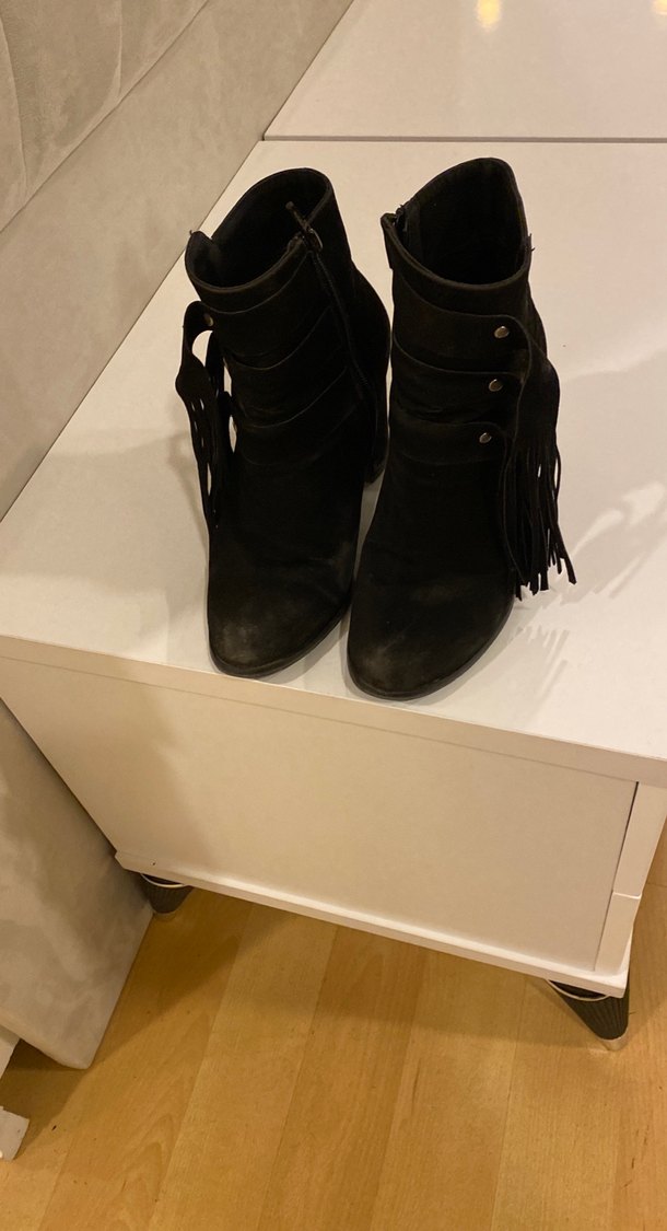 Siyah süet kadın botları, dolgu topuklu ve kemerli detaylı, gotik tarzda püsküllü, trend günlük kullanım için uygun.