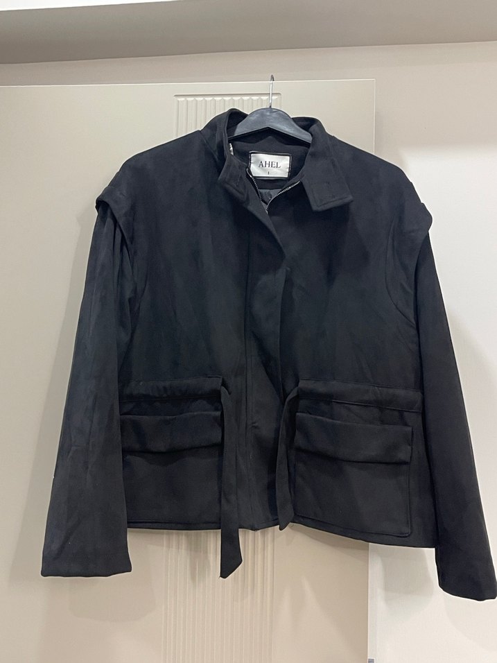Siyah süet kumaştan kemerli, kısa ve regular fit kadın ceket. Uzun kollu ve yakası notched lapel modelindedir. Ahelden almıştım hıc kullanmadım