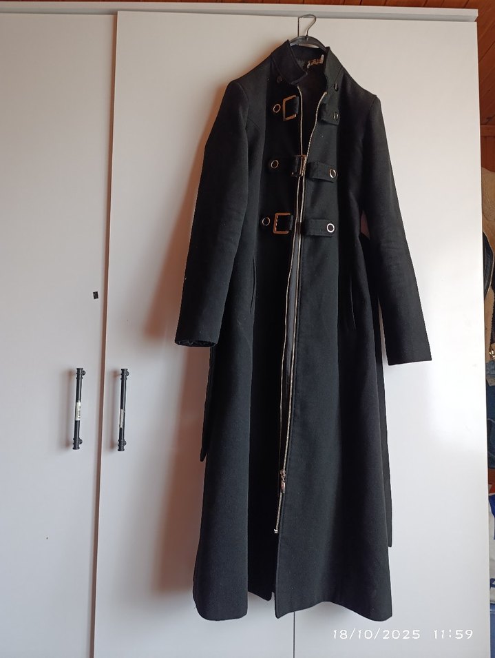 Siyah süet kumaştan, kemerli, notched lapel yakalı ve strappy kollu uzun uzunlukta kadın goth kabanı. Düzenli kesim ve günlük kullanıma uygun. az kullanilmiş yurtdışından gelme bedeni küçük geldiği icin satişta ,42 yaziyor ama galiba 40anca