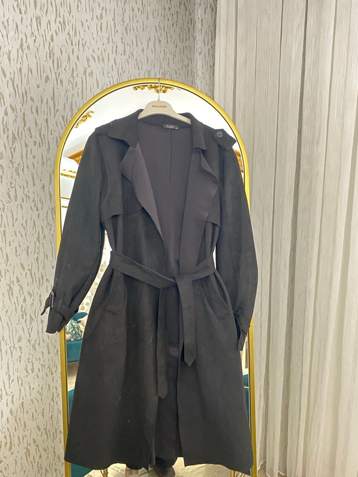 Siyah süet kumaştan, kemerli ve uzun kollu, klasik şıklığa uygun uzun kadın trençkot.kusuru yoktur