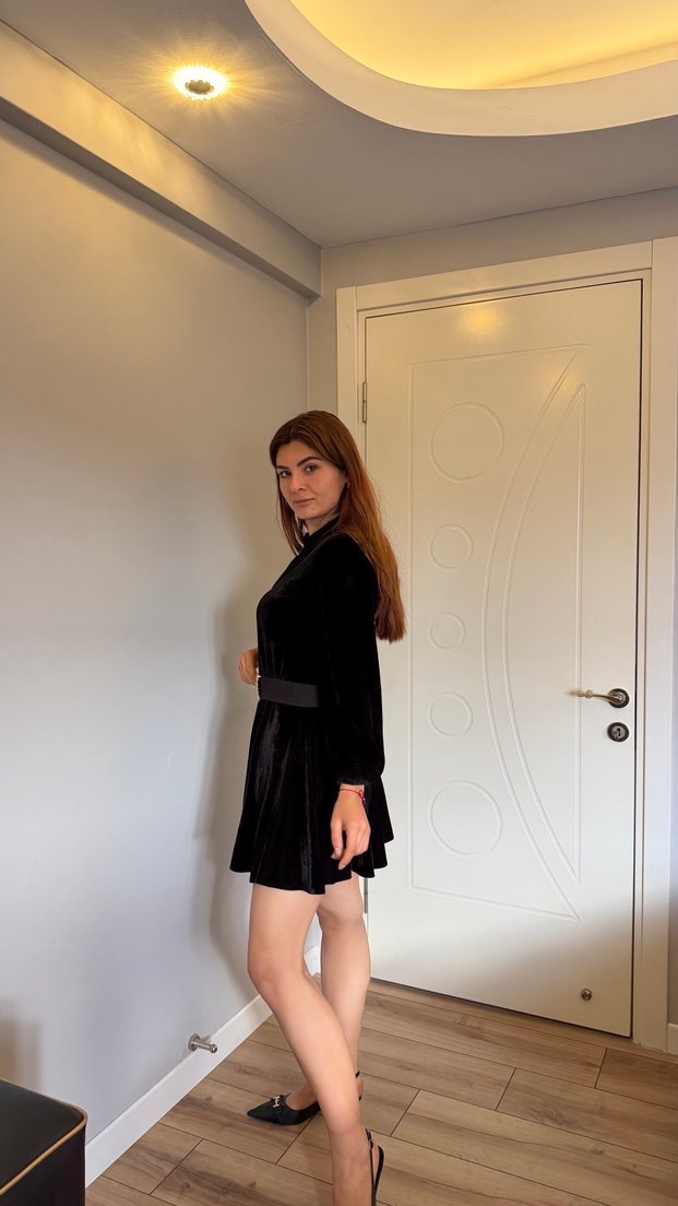 Uzun kollu, yüksek yakalı siyah süet midi elbise, kemerli bel detayıyla cesur bir görünüm sunar. Romantik akşamlar için uygun.