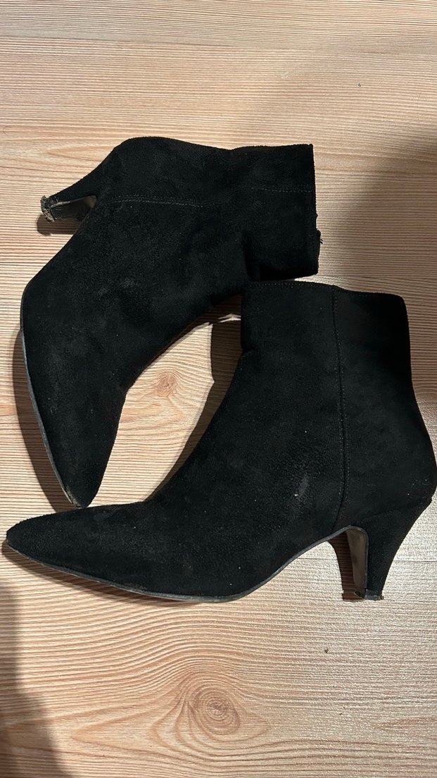 Siyah süet malzemeden yapılmış, kısa topuklu kadın botları. Minimalist gotik tarzda, romantik akşamlar için uygun, desensiz koyu renkte.