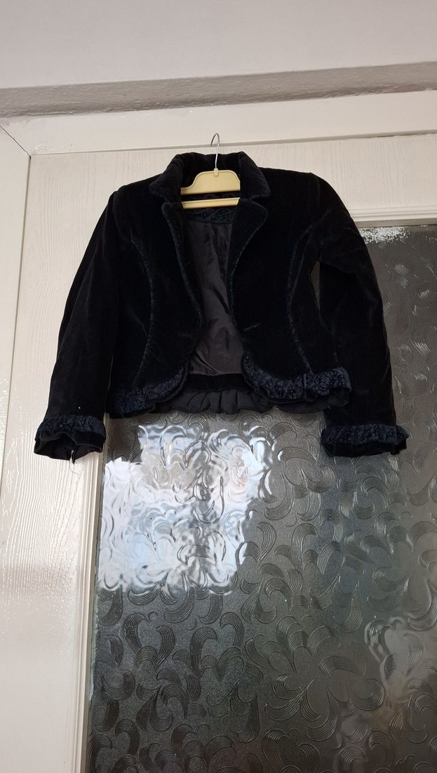 Siyah süet bolero, yakasında kesik yaka ve kürklü detaylara sahip. Uzun kollu, klasik tarzda ve düz desensiz.