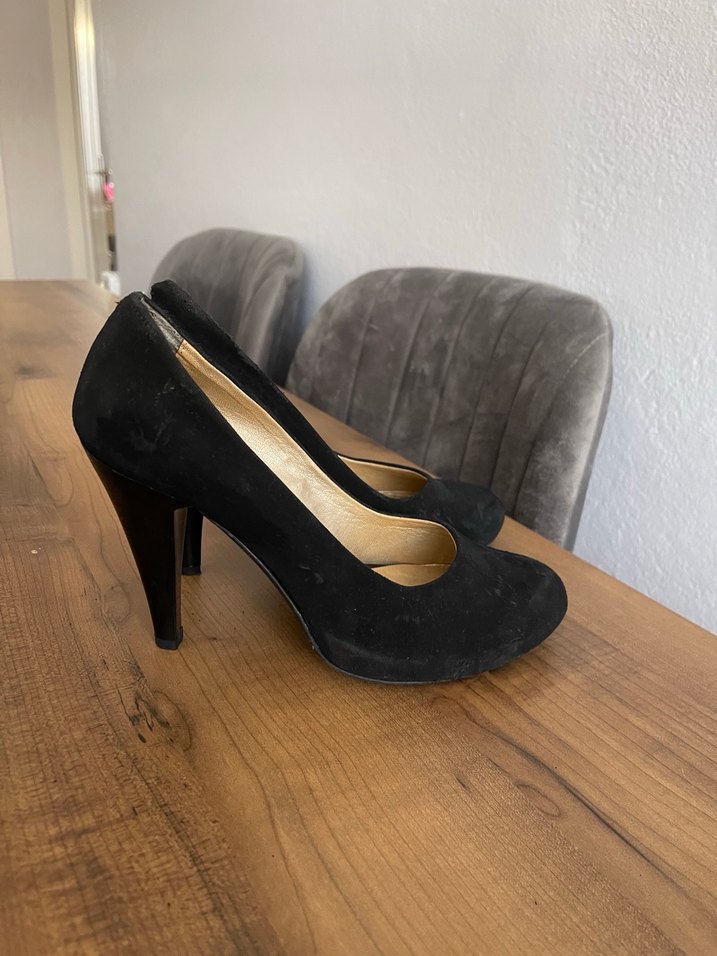 Siyah süet malzemeden, klasik ve gotik tarzda kadın stiletto. Ofis kullanımı için uygun yüksek topuklu ayakkabı. Topuk 10cm, fotoğraflarla görüldüğü gibi kullanıma bağlı kusurları var fiyatı uygun tutuyorum