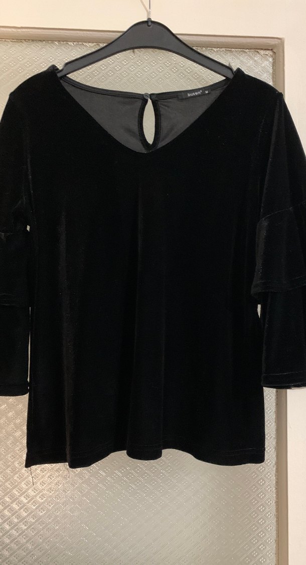 Siyah süet kumaştan, V yakalı ve uzun kollu, bol kesim bluz. Günlük kullanıma uygun gotik tarzda şık bir parça.