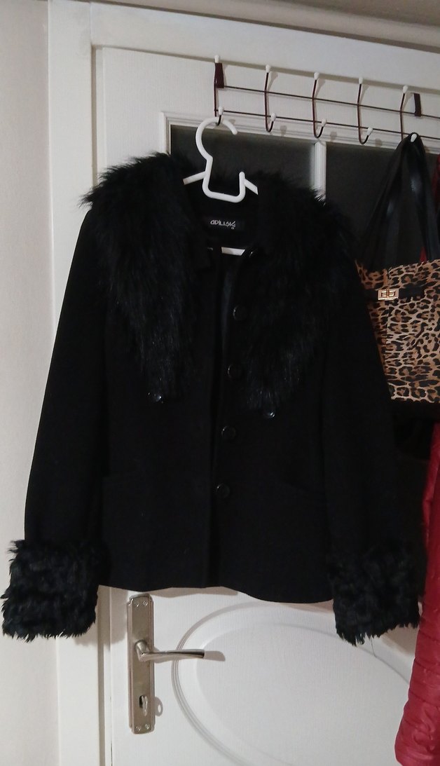 Siyah süet kumaştan, kürk detaylı yakalı ve manşetli, uzun kollu, gövdeye oturan midi uzunlukta ceket. xs beden ama s/m giyebilir