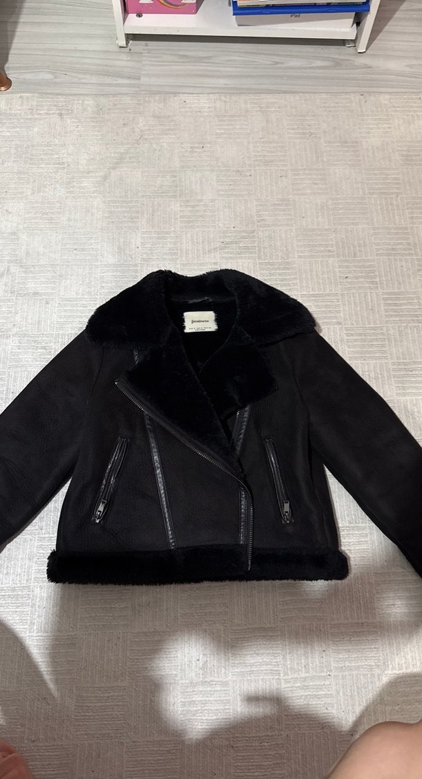 Siyah süet biker ceket, kürk detaylı, kesimli yakalı, dar kesim ve askılı kollu. Fermuarlı cepleri ve rahat, baskılı deseni vardır.