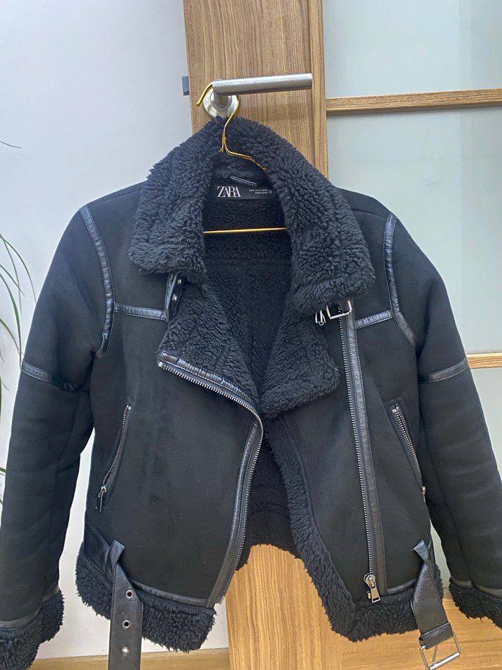 Siyah süet biker ceket, kürk detaylı yaka ve astar, strappy kollu, fitted midi boyda. Notch yaka ve fermuarlı, rahat ve şık. Günlük kullanım için uygun.
