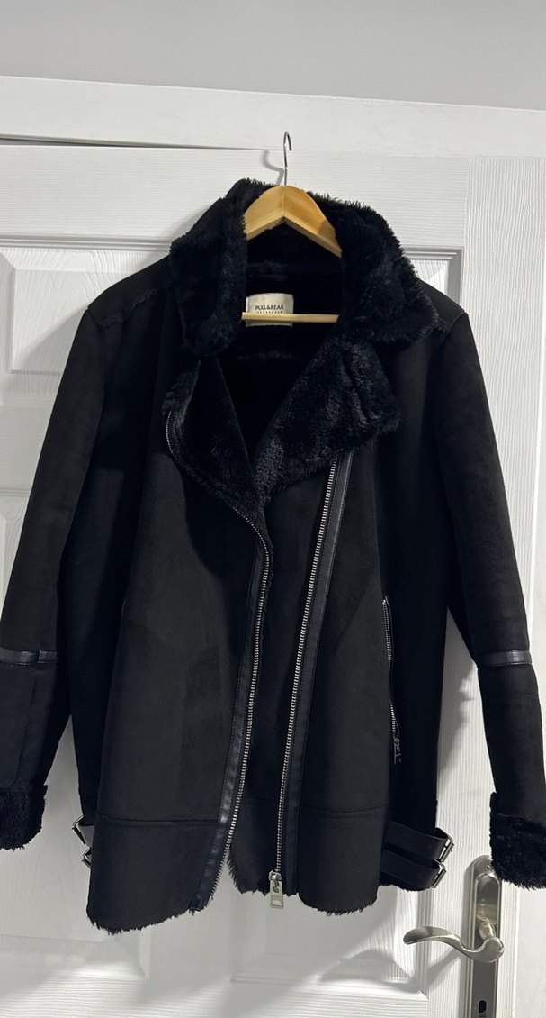 Siyah süet kumaştan yapılmış, kürk detaylı yakalı ve askılı kollu, fit kesim biker ceket. Normal midi boyuyla Paris tarzını yansıtır.