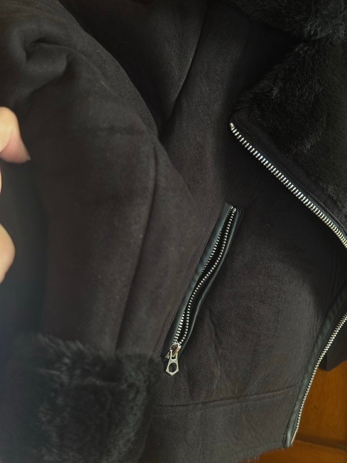 Siyah süet malzemeden yapılmış, kürk detaylı ve strappy kollu biker tarzı bir kaban. Normal uzunlukta ve notched lapel yakaya sahip, günlük kullanıma uygun. Çok az kullanabildim küçük geldiği için satıyorum tertemiz bir sorunu yoktur