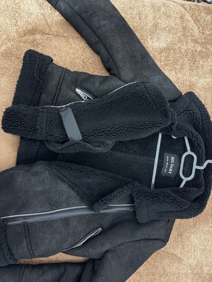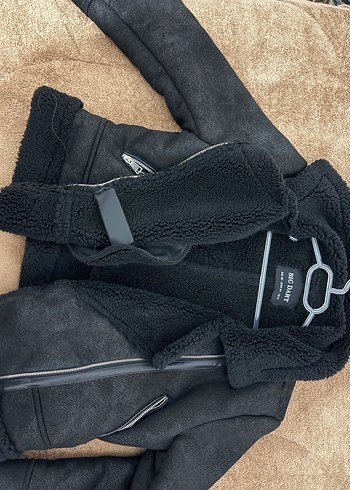 Siyah süet, kürklü detaylı, bele oturan biker tarzı kadın mont. Notlu yakalı, midi boy, askılı kollu, rahat ve şık görünümlü.