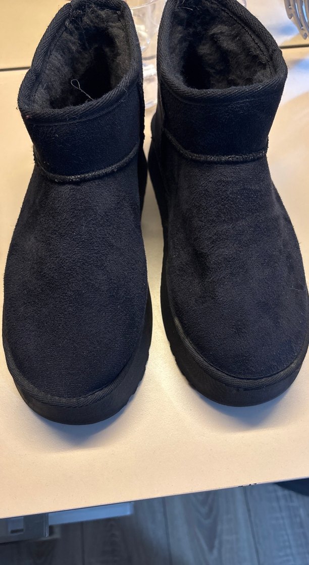 Siyah süet kadın botları, dolgu topuklu ve içi kürklü detaylıdır. Desensiz, rahat ve sade bir tarza sahiptir, günlük kullanım için uygundur.
