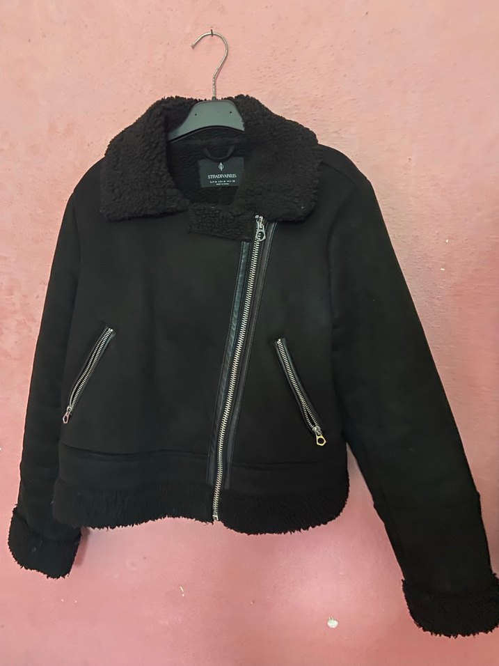 Siyah süet kumaştan yapılmış, kürk detaylı, kesimli ve yaka kısmı kesimli kadin ceket. Asimetrik fermuar ve fermuarlı ceplere sahiptir.