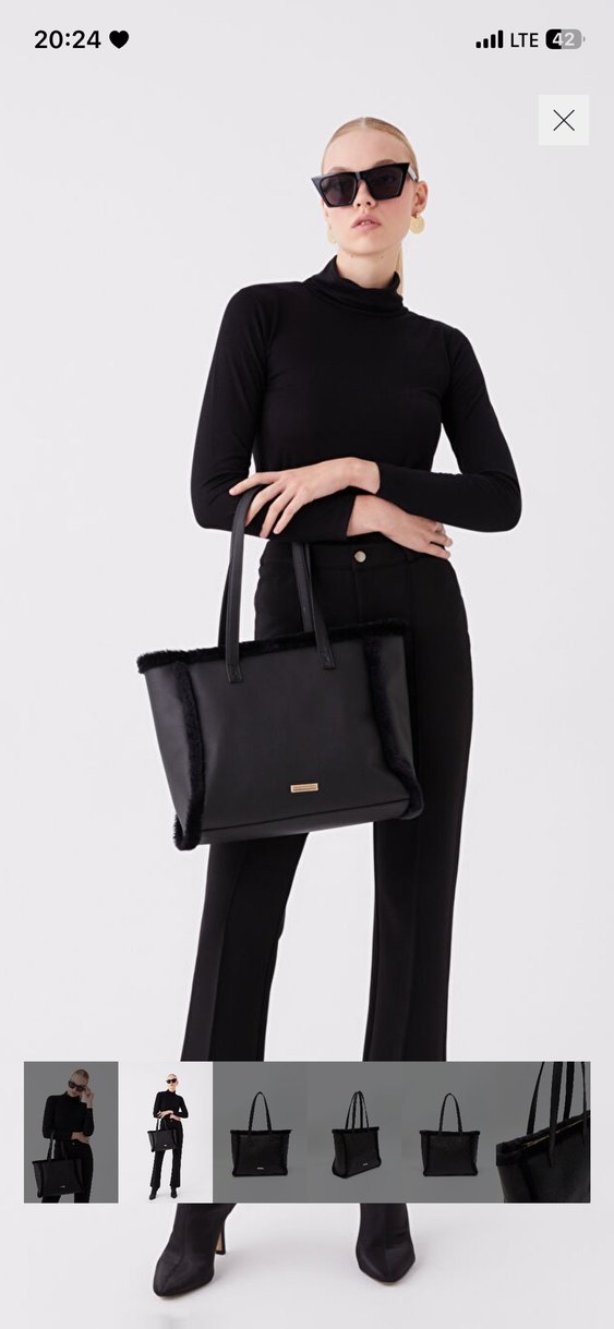 Kürklü detaylara sahip siyah süet kadın çantası, ofis kullanımı için tasarlanmıştır. Klasik ve çağdaş bir stile sahiptir.