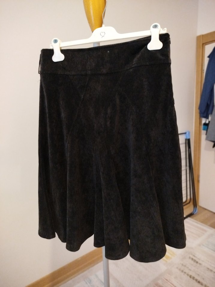 Siyah süet hamile eteği, bol kesim ve pileli tasarımıyla gotik tarz sunar. Midi boyda, desensiz ve koyu renklidir.