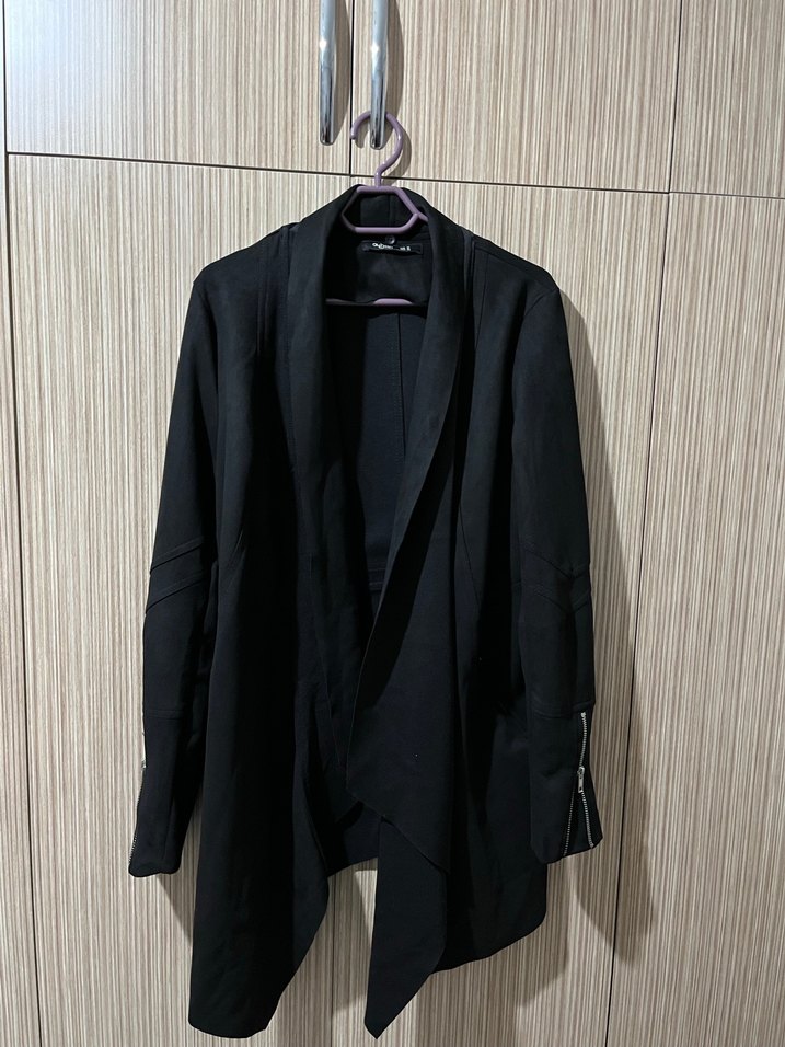 Siyah süet kumaştan yapılmış kadın ceket, kesik yaka ve uzun kolludur. Normal kesim ve midi boyda, yırtmaç detayı bulunur, ofis ve günlük kullanıma uygundur. Herhangi bir defosu yoktur.