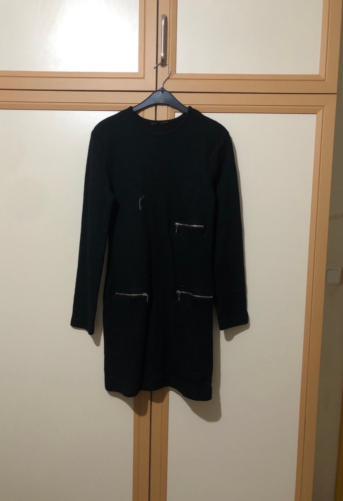Siyah süet midi triko elbise, uzun kollu ve bisiklet yaka, fermuarlı detaylarla minimalist sokak stili sunar. Günlük kullanıma uygun.