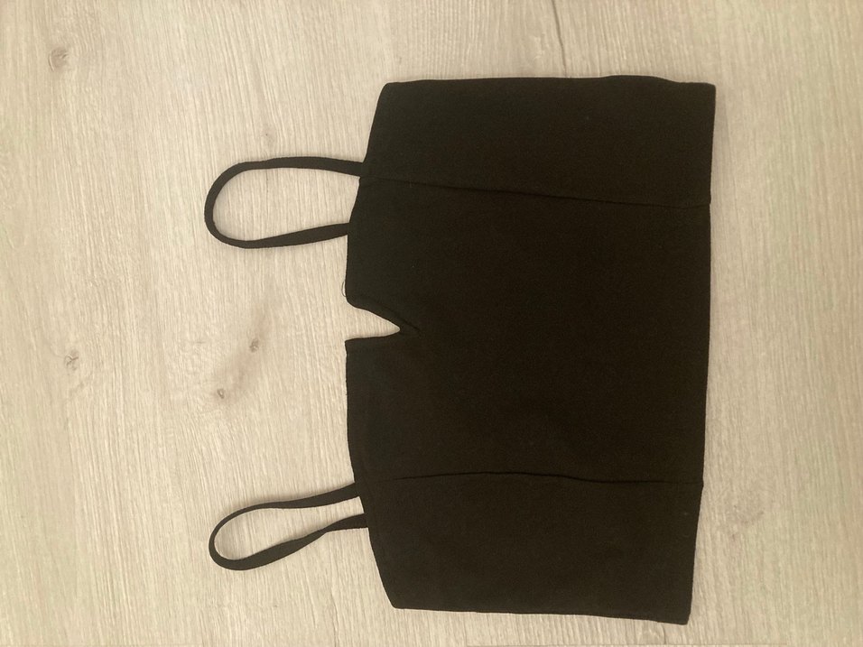 Siyah süet kumaştan, V yakalı ve askılı, fermuarlı, dar kesim midi bustiyer. Minimalist goth tarzıyla günlük kullanıma uygundur.