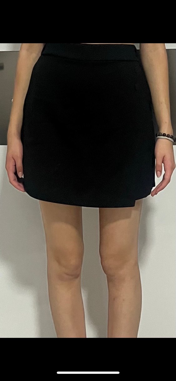 Siyah süet mini şort etek, vücuda oturan kesimi ve desensiz yüzeyiyle cesur, minimalist tarz için uygundur.