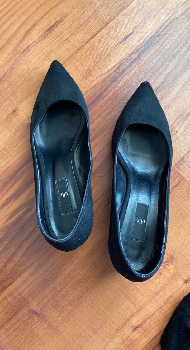 Siyah süet minimal tasarımlı, sivri burunlu ve kauçuk malzemeden yapılmış kadın stiletto topuklu ayakkabılar. Desensiz ve ofis için uygun, cesur gotik stile uyum sağlar. Sıkıntısı yok az kullanıldı topuk boyu 5cm