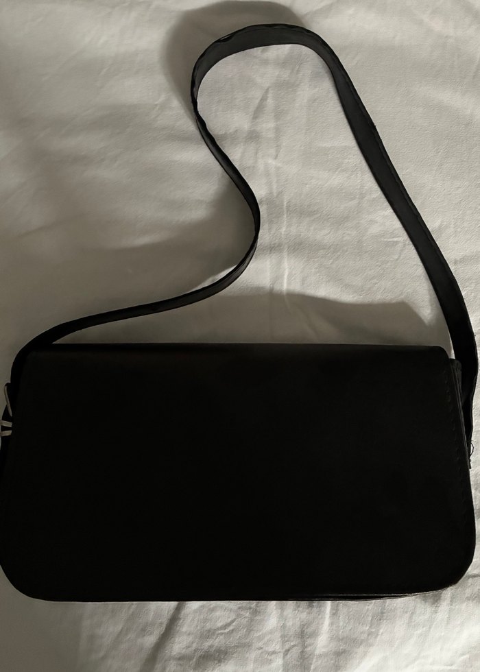 Siyah süet omuz çantası, tokalı askısı ile minimalist ve gotik tarzda. Desensiz ve sade tasarımıyla günlük kullanıma uygundur.