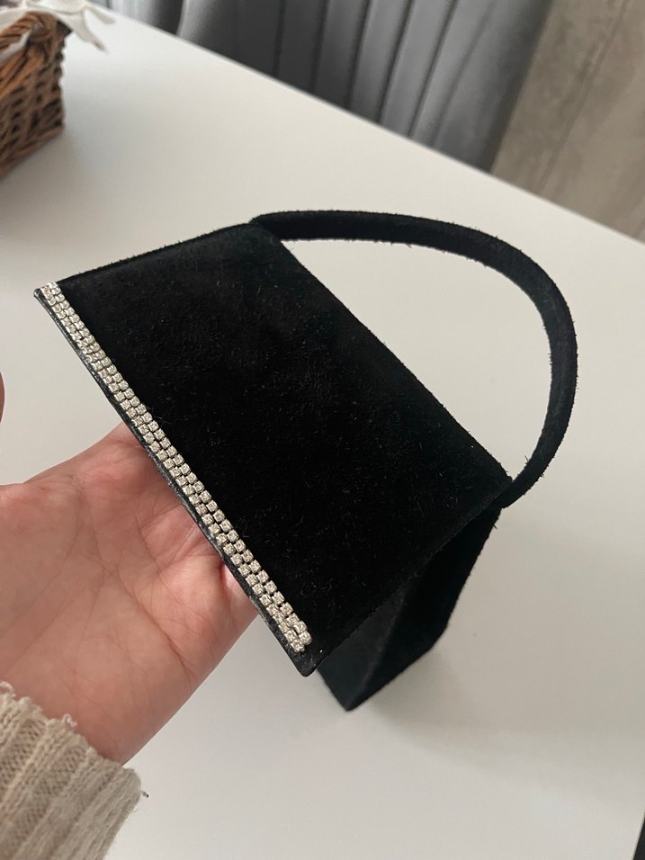 Siyah süet malzemeden yapılmış, parlak taş detaylı kadın çantası. Klasik ve gotik tarzı romantik akşamlar için uygundur. Katlanma yerinde izler oluşmuş onun dışında temizdir