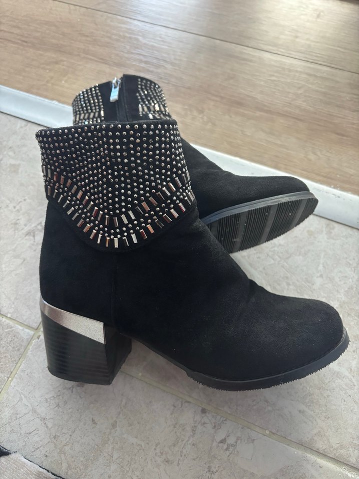 Siyah süet blok topuklu kadın botları, payetli desenli detaylara sahiptir. Trendy casual ve gotik tarzı günlük kullanıma uygundur.