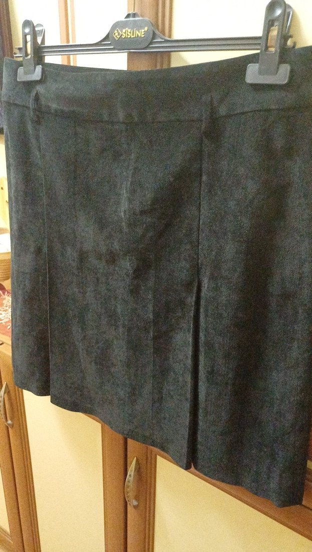 Siyah süet kumaştan yapılmış, pilili ve midi boyda normal kesim hamile eteği, ofis ortamı için uygundur.