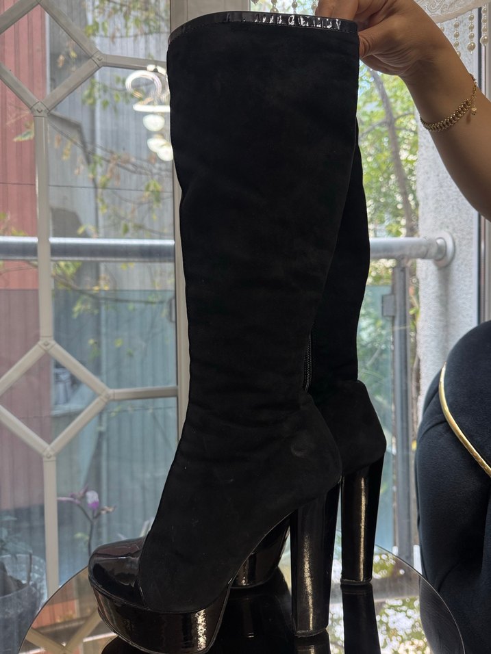 Siyah süet dizüstü botlar, platform topuk ve tokalı detay ile cesur ofis stilleri için yılan desenli şık tasarım sunar.