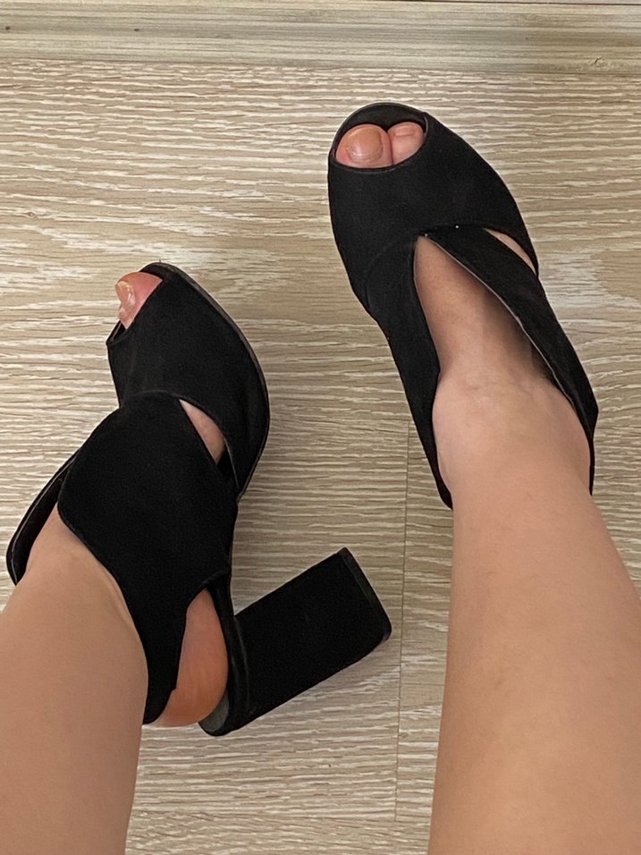 Siyah süet platform topuklu ayakkabılar, blok topuk ve yırtmaç detayına sahip. Cesur ve çağdaş tasarım, romantik akşamlar için minimal desensiz.