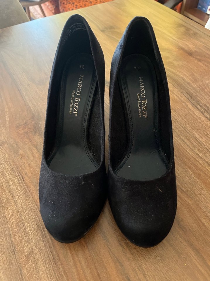 Marco Tozzi markalı siyah süet platform topuklu stiletto, gotik tarzda şık ve desen içermeyen tasarım, romantik akşamlar için zarif ve rahat.Orjinal Danimarka’dan 110 € alındı 5/6 bin civarı . Hiç kullanmadım . Topuklu giyemiyorum artık . Alan güzel günlerde giysin . Gerçek süettir .