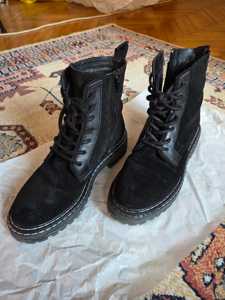 Siyah süet kadın botları, blok topuklu. Grunge punk tarzında, günlük kullanıma uygun koyu renkte ve desensiz.