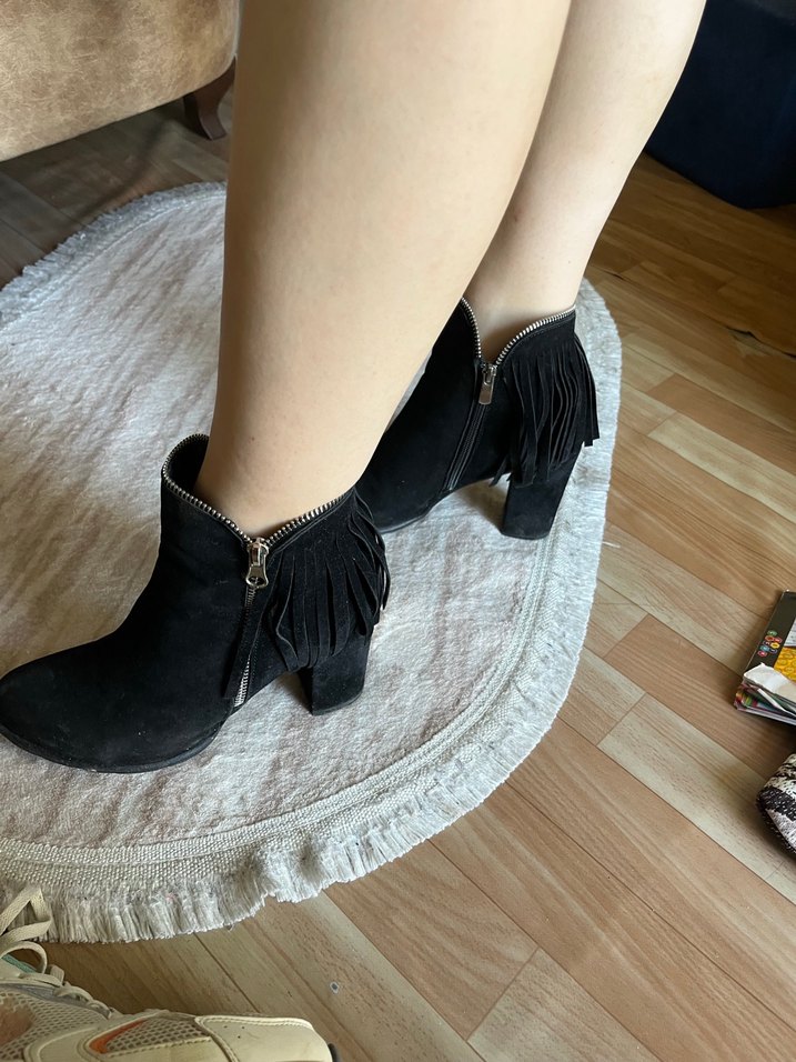 Siyah süet malzemeden yapılmış, blok topuklu ve püskül detaylı botlar. Yanında fermuar bulunur, rahat kullanım sağlar.