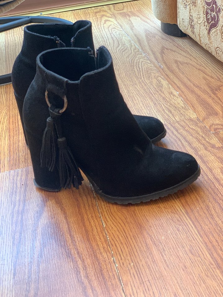 Siyah süet malzemeden yapılmış, blok topuklu ve püsküllü gotik tarzda günlük kullanıma uygun botlar.