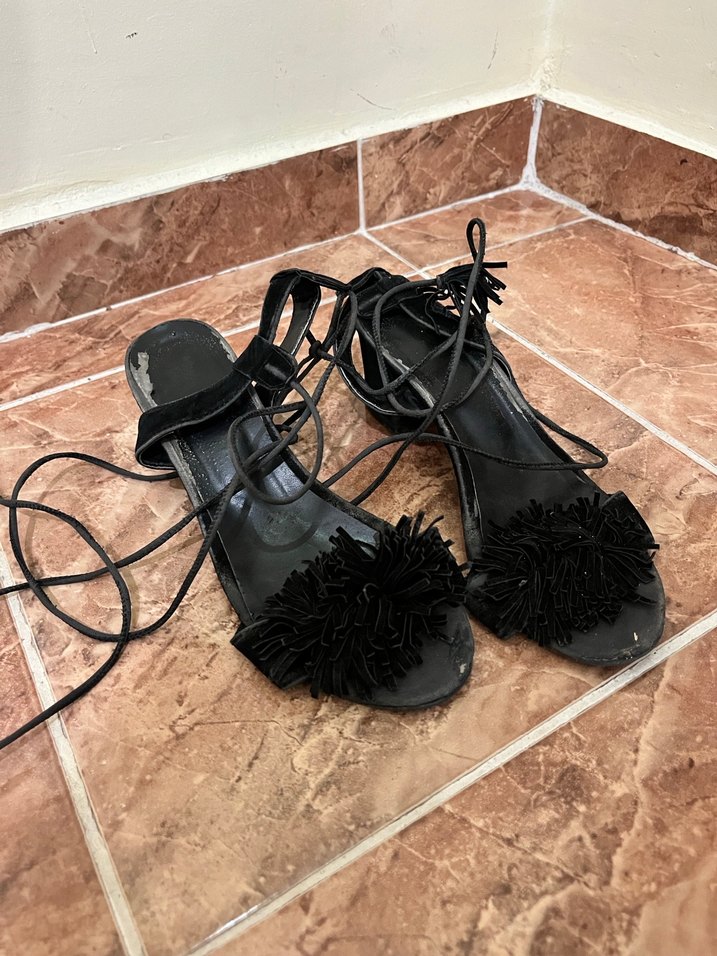 Siyah süet malzemeden yapılmış, işlemeli detaylar ve püsküllü süslemelere sahip bohem stiletto topuklu ayakkabılar, bağcıklı kayışlarla romantik akşamlar için uygundur.