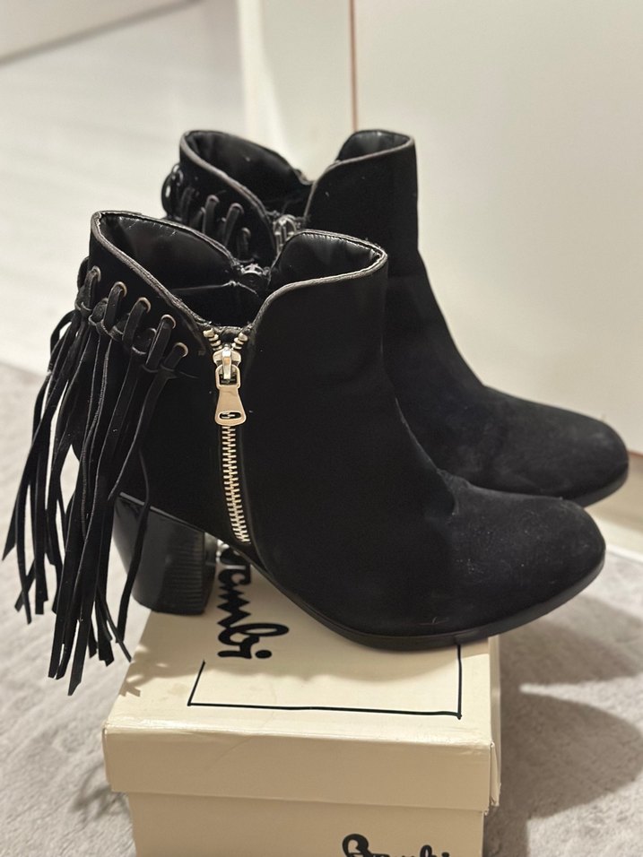 Siyah süet malzemeden yapılmış, yan fermuarlı, püskül detaylı topuklu bot