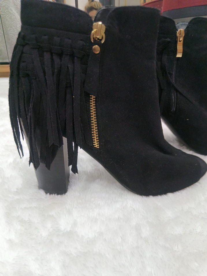 Siyah süet kadın botları, blok topuklu ve püskül detaylıdır. Rahat bohem tarzıyla günlük kullanıma uygundur.