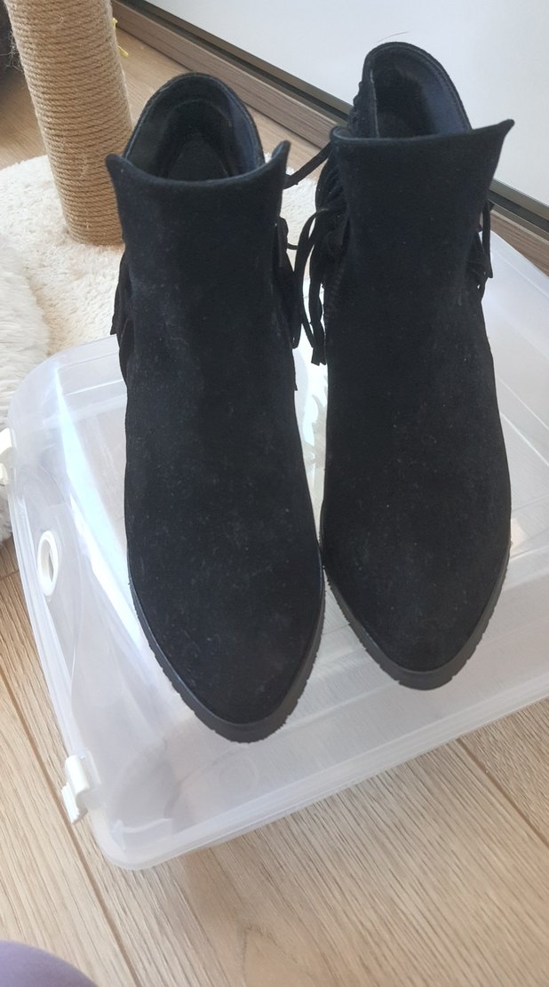 Siyah süet malzemeden, blok topuklu ve püskül detaylı kadın botu. Bohem ve retro tarzlara uygun, günlük kullanıma ideal rahat bir model.
