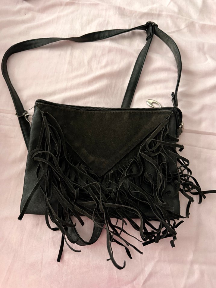 Siyah süet malzemeden yapılmış, püskül detaylı kadın çantası. Ayarlanabilir askısı ile günlük kullanıma uygun, goth ve grunge punk tarzında bir tasarım.