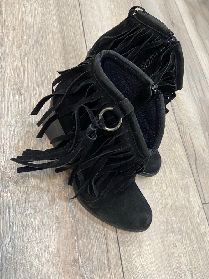 Siyah süet kadın botlar, dolgu topuklu ve tokalı detaylara sahip. Püsküller gotik ve bohem tarzı yansıtıyor. Günlük kullanıma uygun.