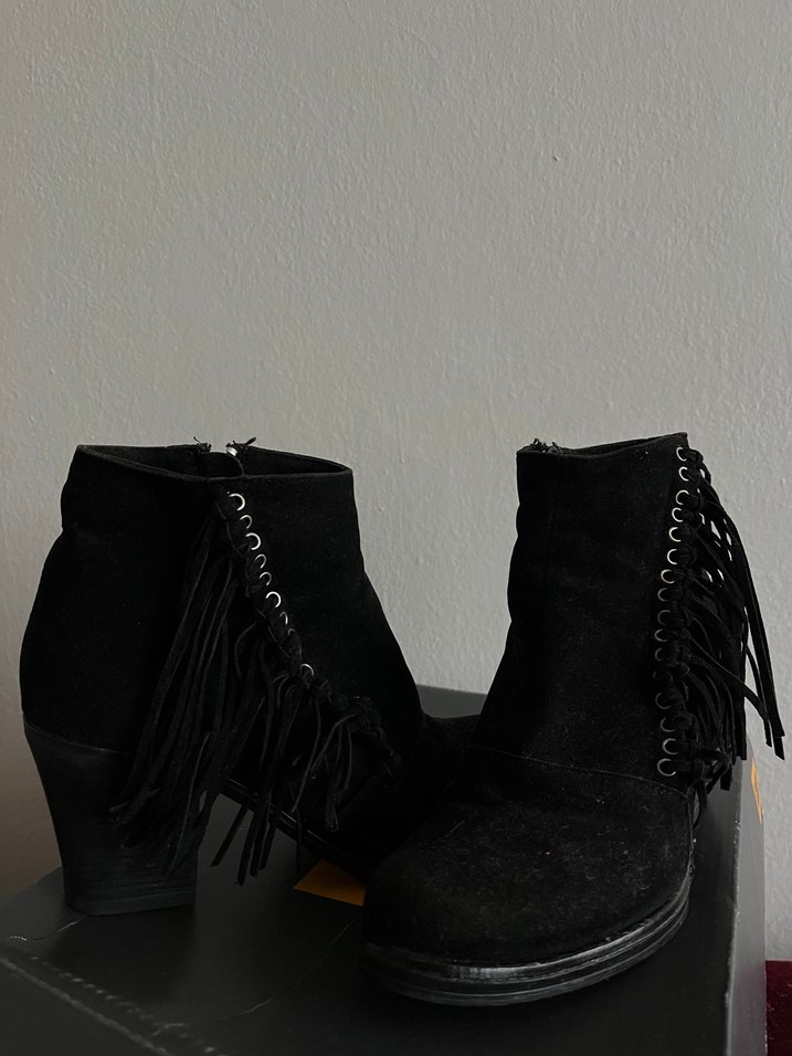 Siyah süet malzemeden yapılmış, püskül detaylı gotik tarzda kadın topuklu bot. Bohem ve retro dokunuşlar içerir, günlük kullanım için uygundur. 37 numaraya da uygundur