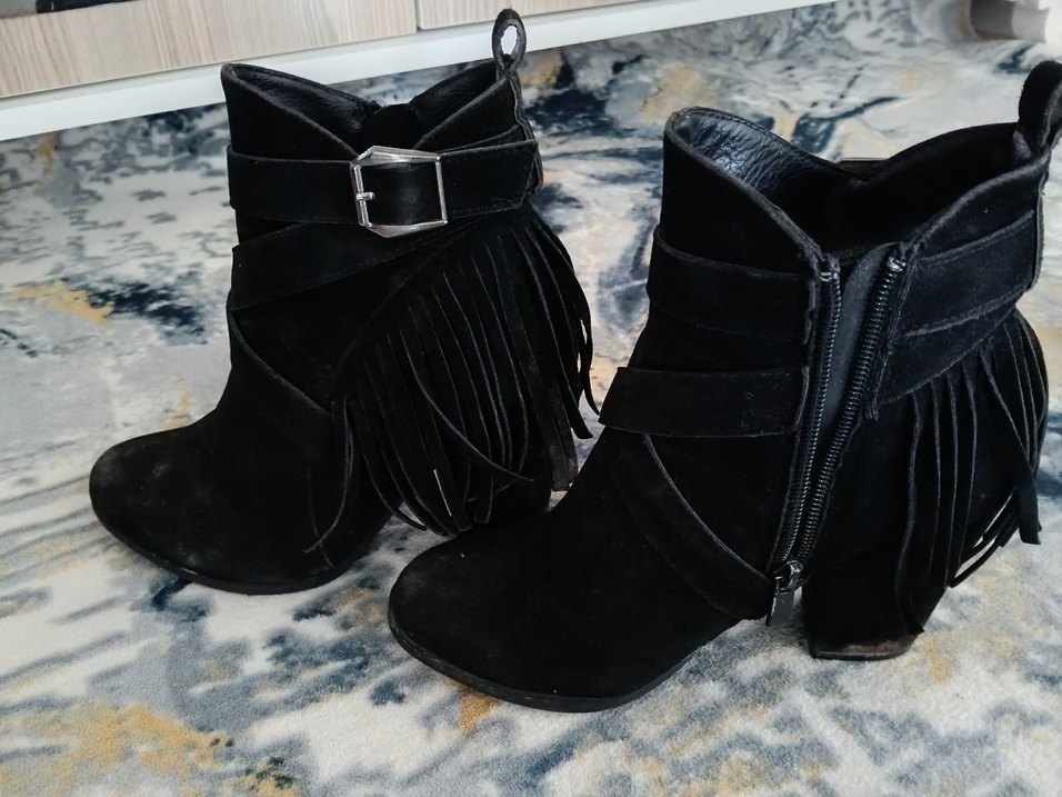 Siyah süet kadın botları, dolgu topuklu ve tokalı kayışlarla püskül detaylıdır. Gotik tarzda, günlük kullanıma uygun şık ve rahat bir model.