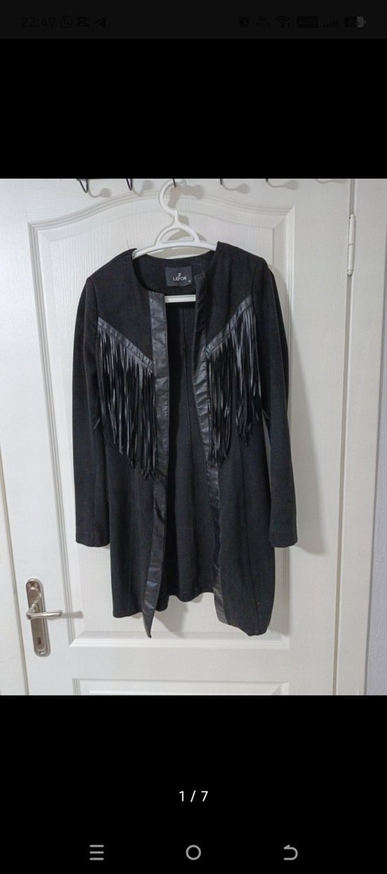 Siyah süet kumaştan yapılmış, uzun kollu ve yakasında püsküller var. Defosuz. Yaklaşık 15 yıllık olup, ne derisinde ne süetinde hiçbir yıpranma yoktur. Butikten alınmıştı. cebi delik