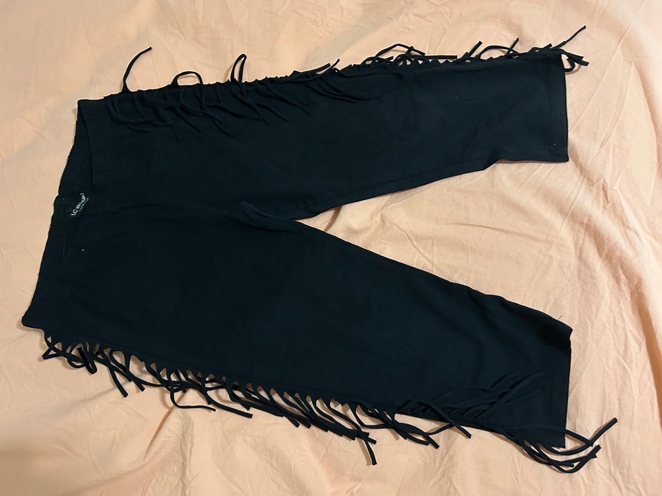 Yumuşak süet kumaştan siyah, vücuda oturan kadın tayt. Yanlarda püsküller bulunur. Uzun boy ve gotik-bohem tarzını yansıtır.