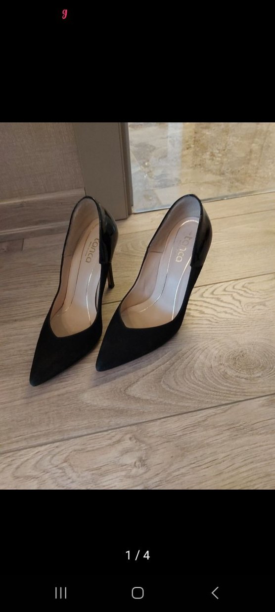Siyah rugan ve süet malzemeden yapılmış, parlak ve şık stiletto topuklu ayakkabı.